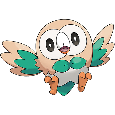 Rowlet es uno de los tres pokémon iniciales de la región de Alola. Este pokémon planta/volador surca el cielo con sigilo y se acerca a los adversarios sin que le detecten, para golpearlos con potentes patadas, o atacar a distancia gracias a las hojas de sus alas.